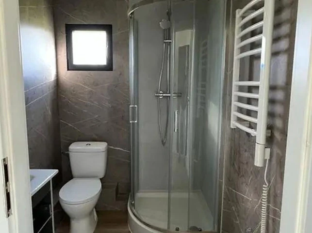 • Salle de bain : Cuvette de toilettes compacte, receveur de douche et robinetterie