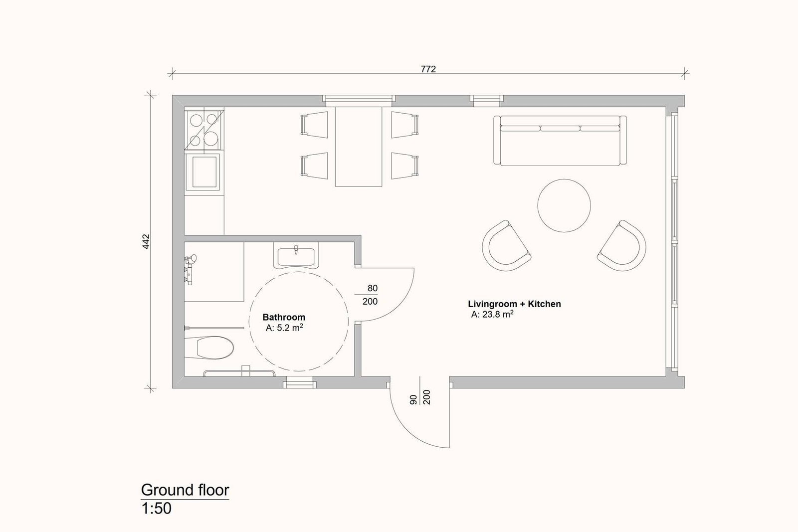 • Aménagement : espace ouvert avec salle de bain séparée, kitchenette